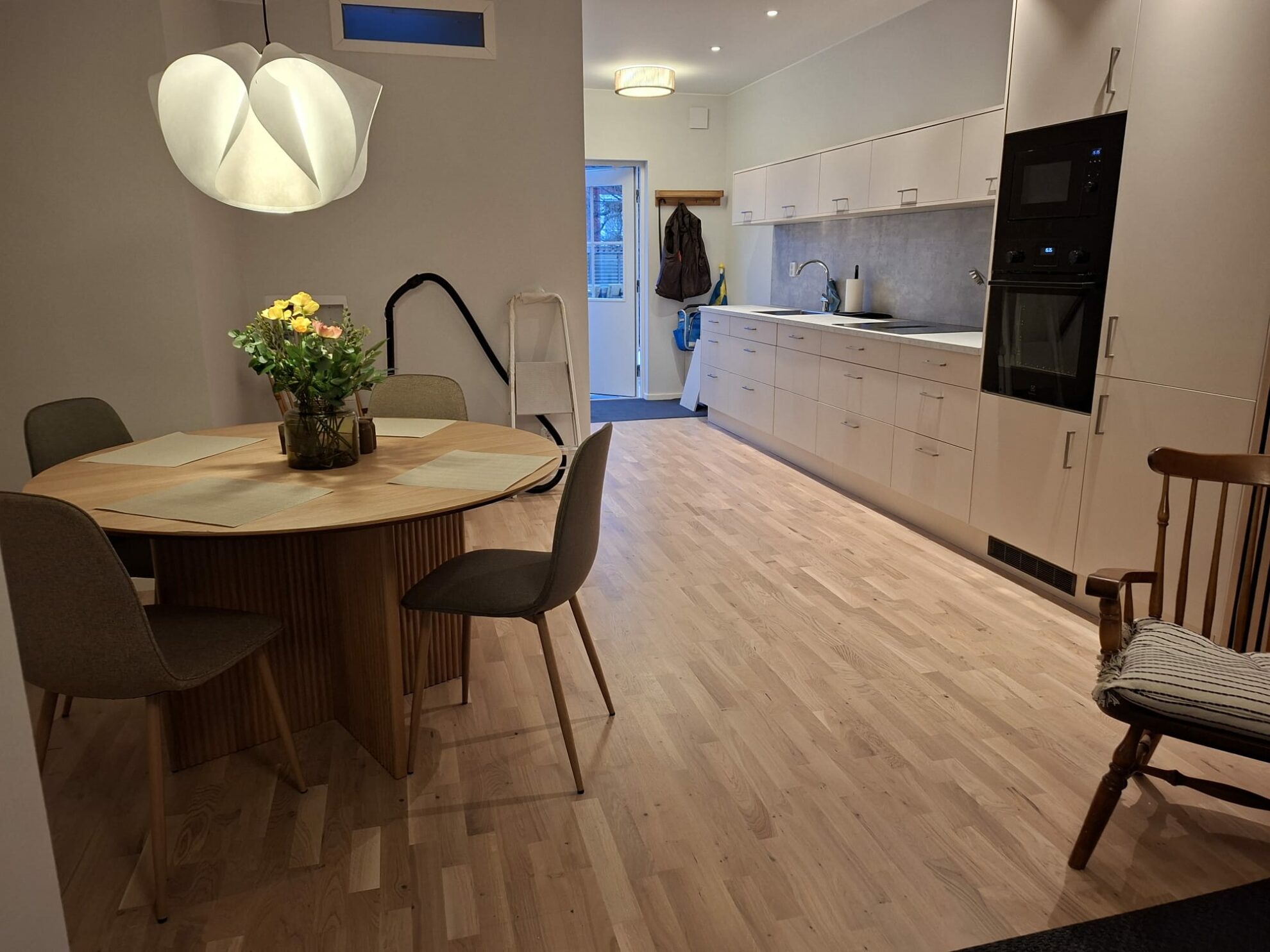 Upptäck ett modernt och stilrent boende där varje kvadratmeter är genomtänkt för komfort och trivsel. Den öppna planlösningen mellan kök och vardagsrum skapar en ljus och social miljö – perfekt för både avkoppling och umgänge.